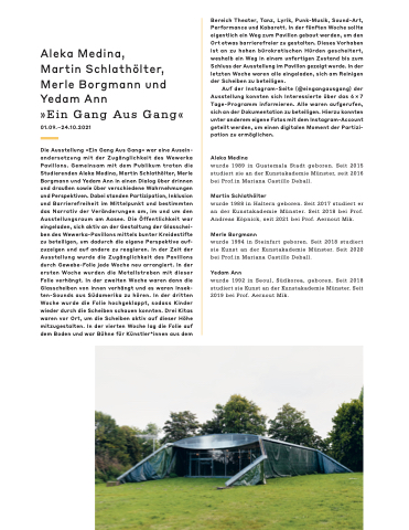Die Ausstellung »Ein Gang Aus Gang« war eine Ausein- andersetzung mit der Zugänglichkeit des Wewerka Pavillons. Gemeinsam mit dem Publikum traten die Studierenden Aleka Medina, Martin Schlathölter, Merle Borgmann und Yedam Ann in einen Dialog über drinnen und draußen sowie über verschiedene Wahrnehmungen und Perspektiven. Dabei standen Partizipation, Inklusion und Barrierefreiheit im Mittelpunkt und bestimmten das Narrativ der Veränderungen am, im und um den Ausstellungsraum am Aasee. Die Öffentlichkeit war eingeladen, sich aktiv an der Gestaltung der Glasschei- ben des Wewerka-Pavillons mittels bunter Kreidestifte zu beteiligen, um dadurch die eigene Perspektive auf- zuzeigen und auf andere zu reagieren. In der Zeit der Ausstellung wurde die Zugänglichkeit des Pavillons durch Gewebe-Folie jede Woche neu arrangiert. In der ersten Woche wurden die Metallstreben mit dieser Folie verhängt. In der zweiten Woche waren dann die Glasscheiben von innen verhängt und es waren Insek- ten-Sounds aus Südamerika zu hören. In der dritten Woche wurde die Folie hochgeklappt, sodass Kinder wieder durch die Scheiben schauen konnten. Drei Kitas waren vor Ort, um die Scheiben aktiv auf dieser Höhe mitzugestalten. In der vierten Woche lag die Folie auf dem Boden und war Bühne für Künstler*innen aus dem
