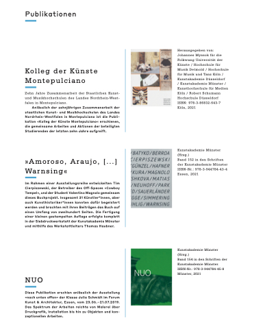 Anlässlich der zehnjährigen Zusammenarbeit der staatlichen Kunst- und Musikhochschulen des Landes Nordrhein-Westfalen in Montepulciano ist die Publi- kation «Kolleg der Künste Montepulciano« erschienen, die gemeinsame Arbeiten und Aktionen der beteiligten Studierenden der letzten zehn Jahre aufgreift.