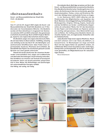 Vom 17. Juli bis 29. August 2021 zeigte die Kunst- und Museumbibliothek der Stadt Köln Booklets von 17 Stu- dierenden der Kunstakademie Münster. Die Booklets wurden mit Nora Schattauer in insgesamt vier Semina- ren zwischen 2019 und 2021 entwickelt. Das gemeinsam erarbeitete Ausstellungs-Buch enthält Original-Beiträ- ge, kopierte und original überarbeitete Zeichnungen.