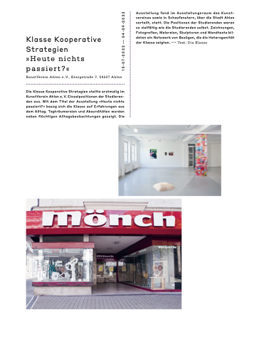 Die Klasse Kooperative Strategien stellte erstmalig im KunstVerein Ahlen e. V. Einzelpositionen der Studieren- den aus. Mit dem Titel der Ausstellung »Heute nichts passiert?« bezog sich die Klasse auf Erfahrungen aus dem Alltag. Tagträumereien und Absurditäten wurden neben flüchtigen Alltagsbeobachtungen gezeigt. Die