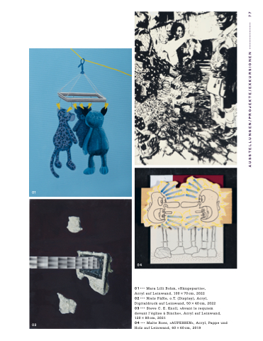 02 Niels Fäßle, o.T. (Display), Acryl, Digitaldruck auf Leinwand, 50 × 40 cm, 2022 03 Steve C. E. Knoll, »Avant le requiem devant l’église à Binche«, Acryl auf Leinwand, 120 × 80 cm, 2021