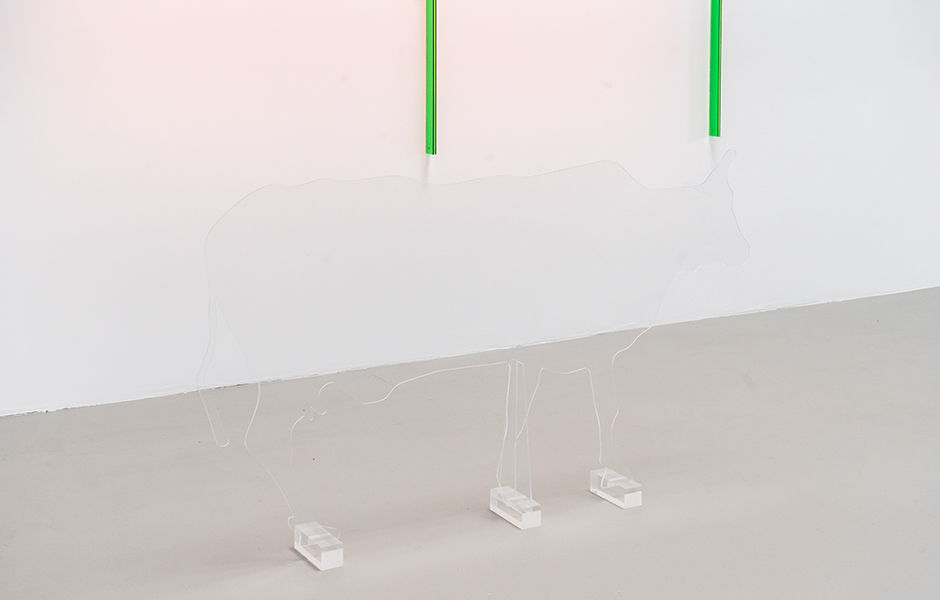 Zwei Stabheuschrecken tasten sich scheinbar schwerelos in somnambuler Anverwandlung an der Metallstange entlang. Ihre rhythmischen, mimetisch schwingenden Bewegungen ahmen eine abwesende Natur nach, die ein um die Szene gebauter Green-Screen ersetzt.